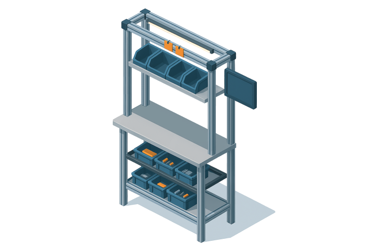 Nous créons des postes optimisés pour limiter la pénibilité et fluidifier les gestes. Hauteur, orientation, accessibilité, rangement : tout est configuré selon vos opérateurs, vos flux et vos objectifs de performance.