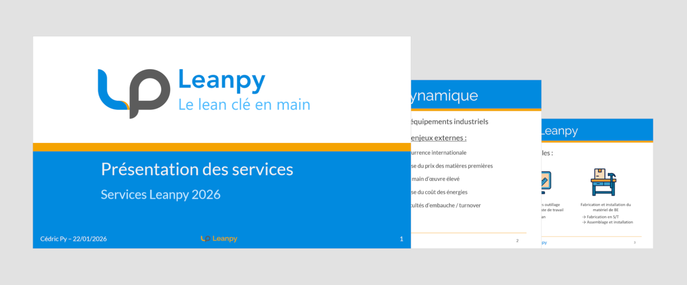 Le Lean est souvent perçu comme trop théorique. Nombre d'entreprises se contentent de former leurs équipes, passant à côté de la vraie force du Lean. Chez Leanpy nous savons que toutes les entreprises ont leurs problématiques à gérer : manque de ressources, urgences, changements de priorités ... C'est pourquoi nous proposons une approche clé en main, la plus complète possible. Avec un seul et même interlocuteur, vous pourrez définir un périmètre, vous former, apporter des améliorations à vos infrastructures et même faire installer du matériel si le projet le nécessite.